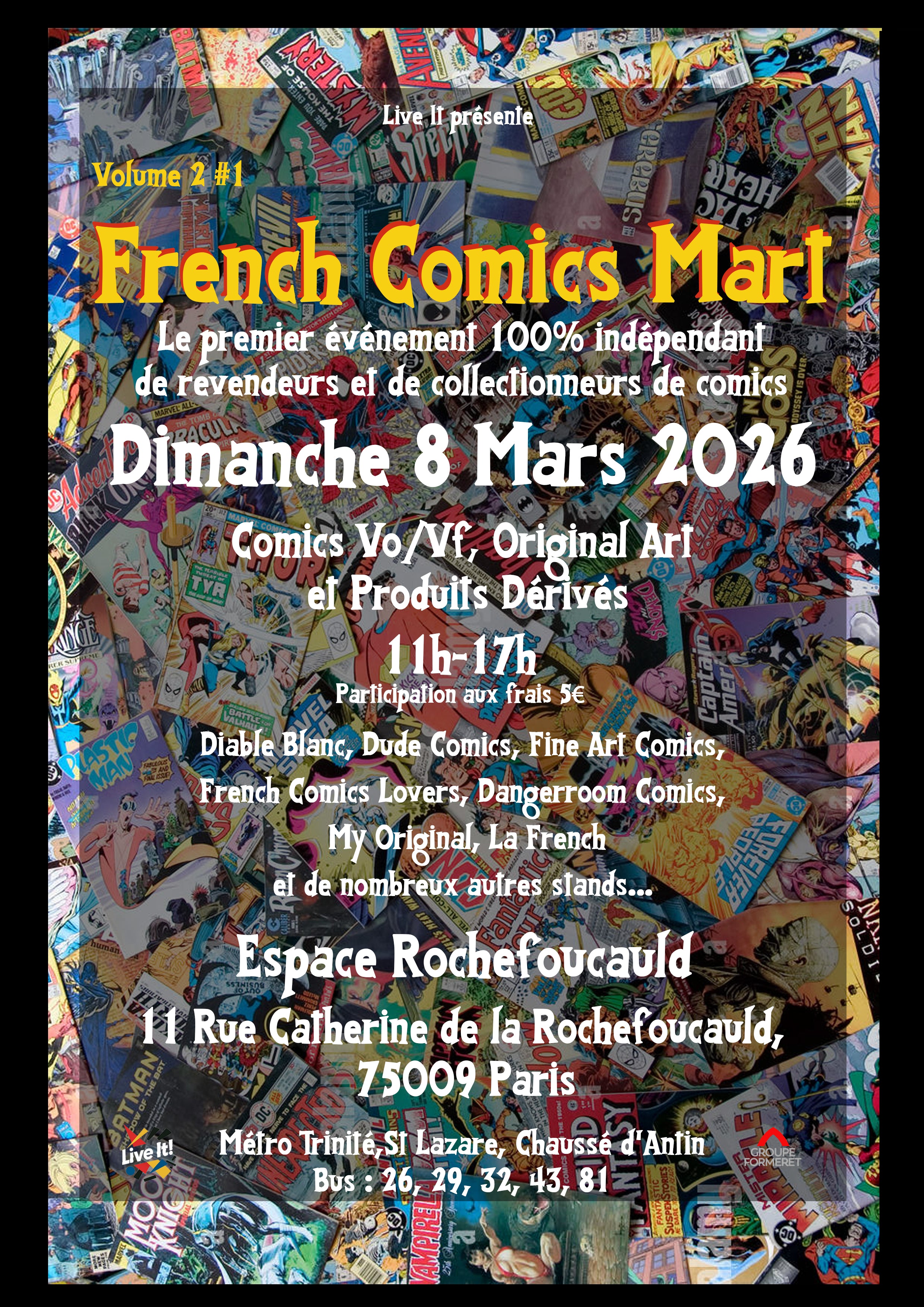 La FRENCH COMICS MART vol2 #1 aura lieu le DIMANCHE 8 MARS de 11h00 à 17h00 à L'espace La Rochefoucauld , 11 Rue Catherine de la Rochefoucauld, 75009 Paris.